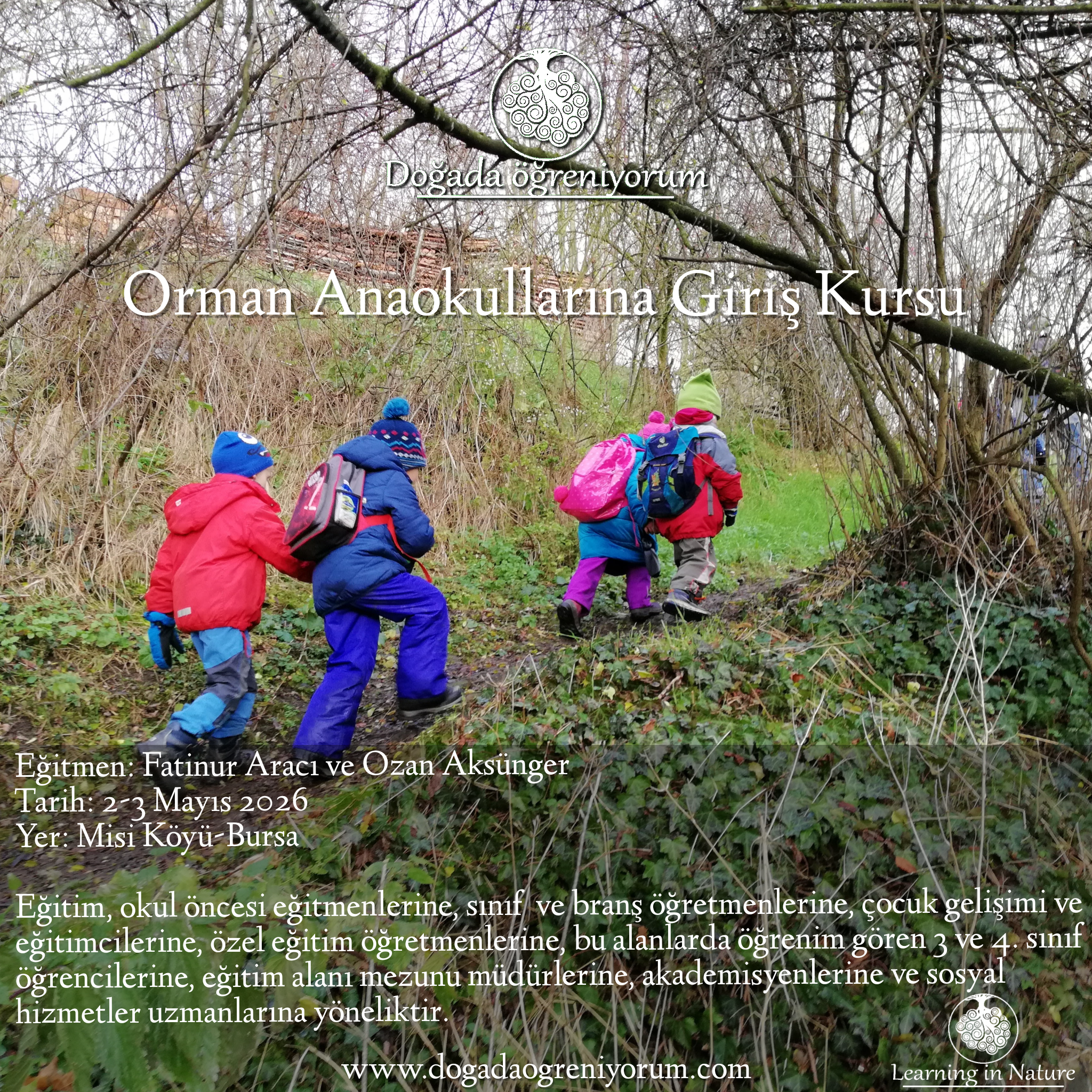 Eğitimlerin birinci aşaması olan Orman Anaokullarına Giriş kursu Fatinur Aracı ve Ozan Aksünger ile 2-3 Mayıs’ta Bursa’da gerçekleşiyor. 1. aşama kursumuza siz değerli eğitmenlerin büyüyen ve genişleyen sınıf dışı eğitim (outdoor education) ağımıza davet ediyoruz. Kursa, okul öncesi eğitmenlerin, ilköğretim sınıf ve branş öğretmenlerin, çocuk gelişimi ve eğitimcilerin, özel eğitim öğretmenlerin, bu alanlarda öğrenim gören 3. ve 4. sınıf öğrencilerin, eğitim alanı mezunu müdürlerin, akademisyenlerin,psikologların, PDR ve sosyal hizmetler uzmanların başvuruları kabul edilecektir.