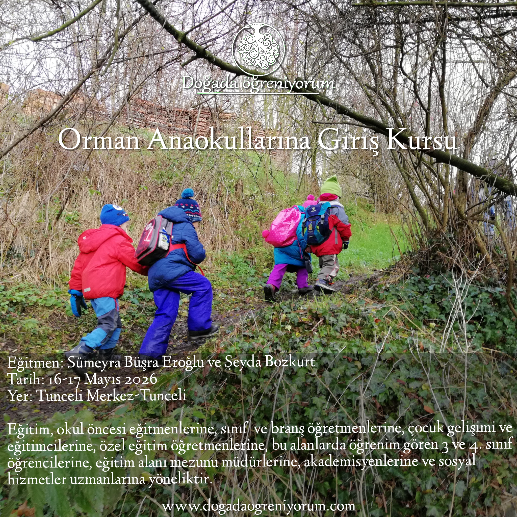 Eğitimlerin birinci aşaması olan Orman Anaokullarına Giriş kursu Sümeyra Büşra Sözbilir ve Şeyda Bozkurt ile 16-17 Mayıs’ta Tunceli’de gerçekleşiyor. Tunceli’de ikinci kez düzenlenecek 1. aşama kursumuza siz değerli eğitmenlerin büyüyen ve genişleyen sınıf dışı eğitim (outdoor education) ağımıza davet ediyoruz. Kursa, okul öncesi eğitmenlerin, ilköğretim sınıf ve branş öğretmenlerin, çocuk gelişimi ve eğitimcilerin, özel eğitim öğretmenlerin, bu alanlarda öğrenim gören 3. ve 4. sınıf öğrencilerin, eğitim alanı mezunu müdürlerin, akademisyenlerin,psikologların, PDR ve sosyal hizmetler uzmanların başvuruları kabul edilecektir.